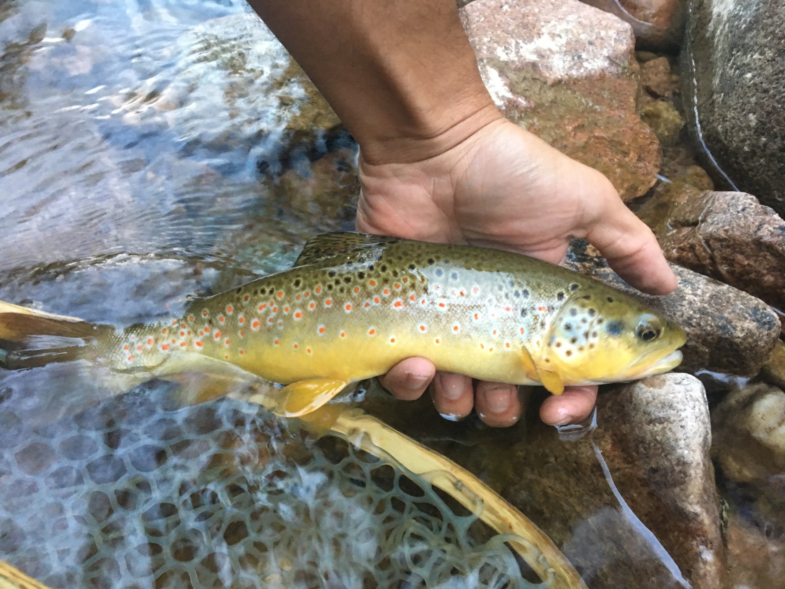 Who the hell uses 7X tippet anyway? I can barely tighten a knot on this spiderweb thread without snapping it in half. But stubbornly I persisted. The next pool produced another brown of the same heftiness. I don’t know how the tippet held up, but the light was fading, and I didn’t want to take the time to switch to something more girthy.