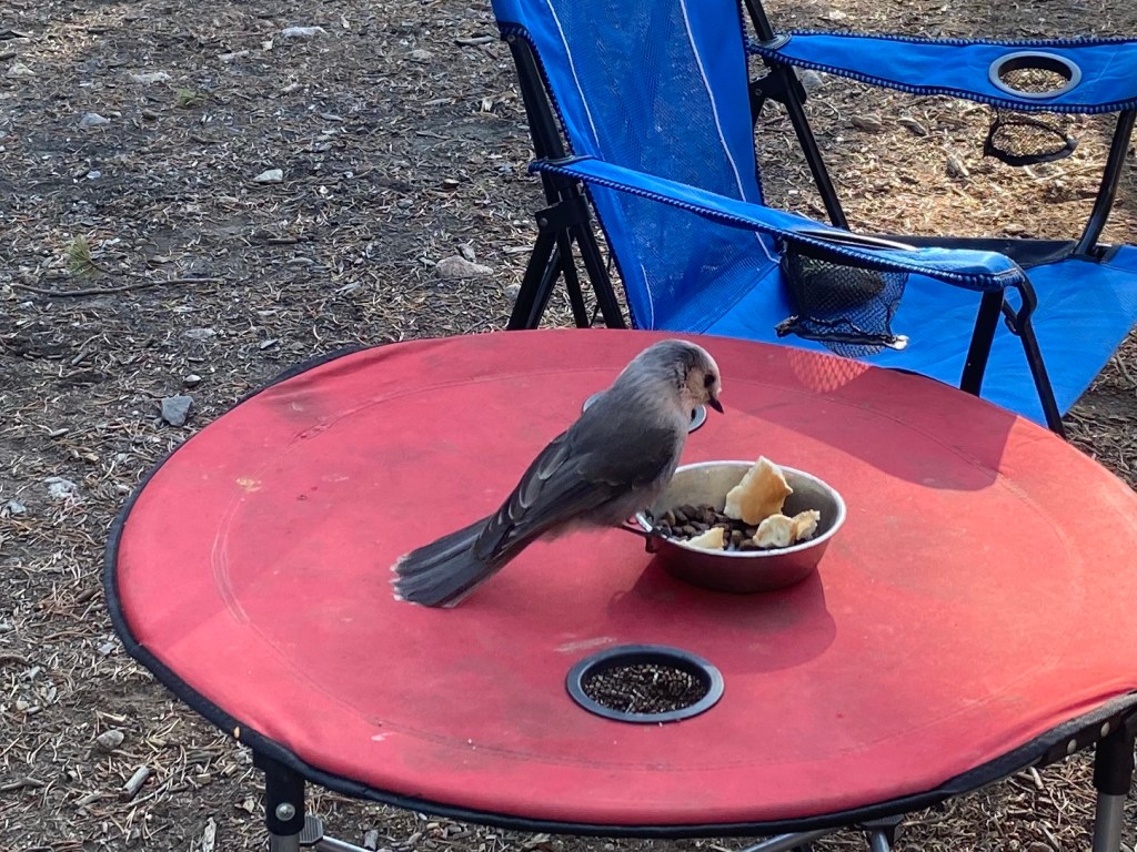 Another cool aspect of this site, and maybe it’s because of the time of year, the Stellar Jays and Grey Jays were ravenous. This is horrible, I know, but they ate so much dog food, I’m sure they got sick or started barking. And they had no fear of us or the dog. They’d swoop down, stuff their faces with up to five kibbles then fly off into the forest to choke it down. And if they weren’t foundering on Purina, they were nipping at any food still left on plates or silverware that was laying around waiting to get washed. Some environmentalist I am. What next? Feeding the ducks at the park? God forbid.