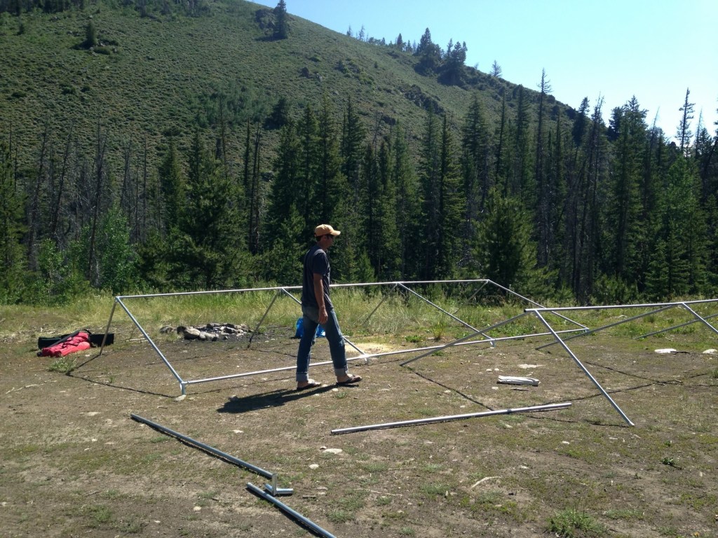 What you will need is plenty of space to carry the tent and the poles. The poles are 8′ long and the tent bag is a little more than you’ll want to carry very far. Did I make the mistake of not realizing this? Sure did. I went and picked the whole setup up from Davis in our old Dodge Durango and luckily the back window opened because the poles were sticking out like a cannon fuse. I realized immediately with this new wall tent lifestyle I’d have to buy a small trailer to haul all our stuff and family and dogs. So I drove to Harbor Freight to pick up their 4×8 utility trailer and drag it home in time for the first camping trip the next day. After purchase, they rolled out 4 heavy boxes to my vehicle. That night by headlamp I assembled a “highway legal” trailer on my deck and said a little prayer the next day as I loaded it down with all our gear and the crisp new tent and drove up to Lost Creek Wilderness, still without tags. Getting those tags is a whole other story. I do not recommend this trailer, but it did last us five years and we did beat the ever living hell out of it. But it ain’t fancy and you better be handy to assemble it so it doesn’t explode into a thousand pieces on the highway.