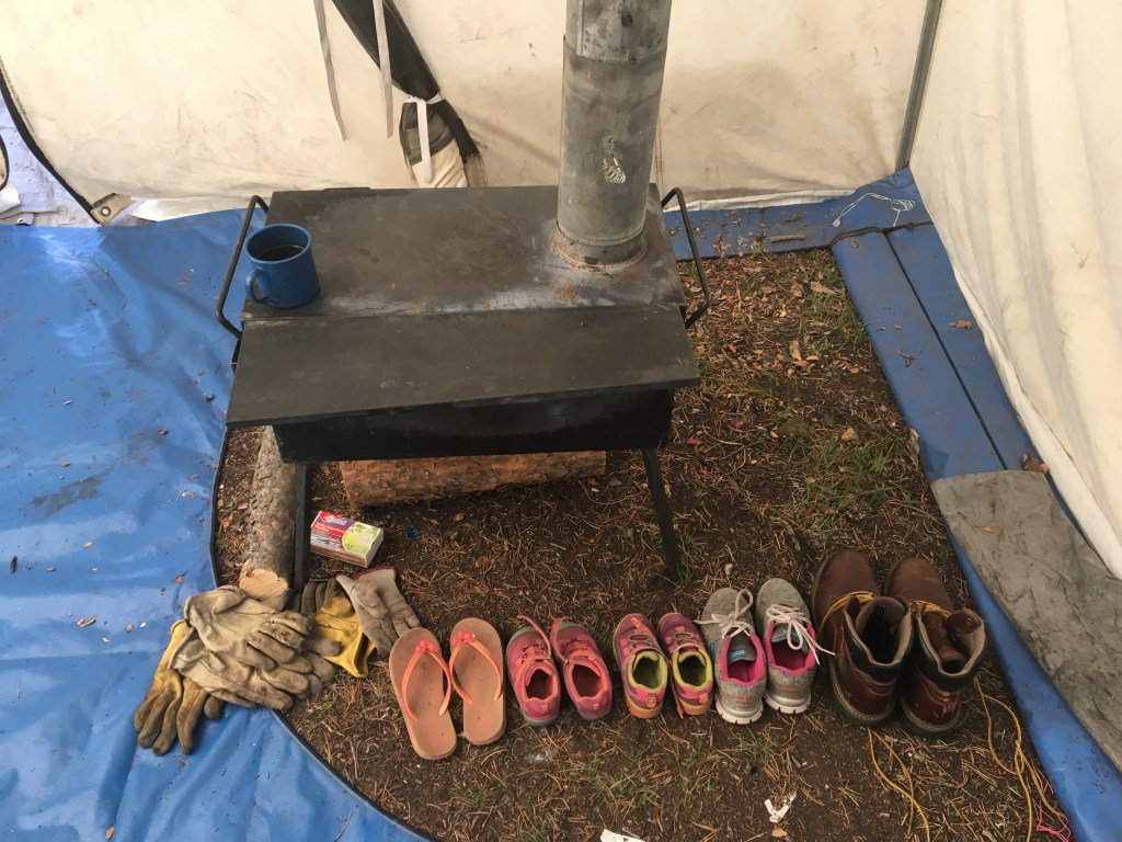 Later that season we found a tent stove on Craigslist and this wall tent became a 4 season home. In seven years of camping which adds up to about 150 nights under canvas, this baby has never sprung a leak and the zippers have never failed. I suggest opting for the bug screen on the front and back doors as well. During those warm summer days, it gets toasty in there and worth having the breeze without the insects.