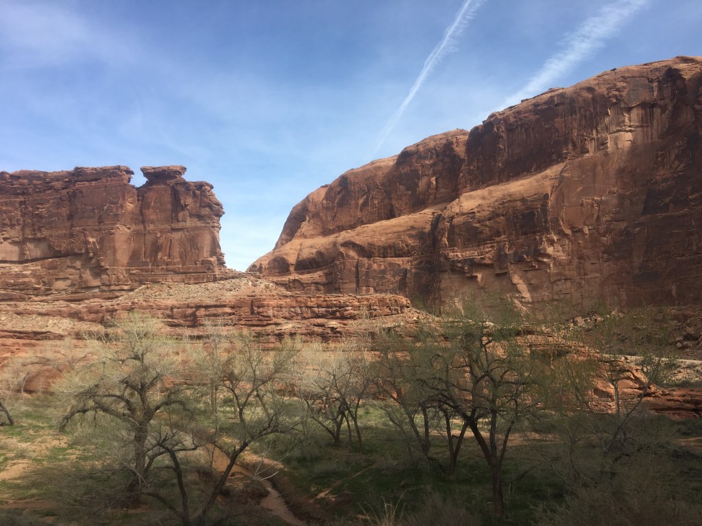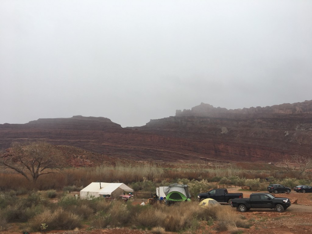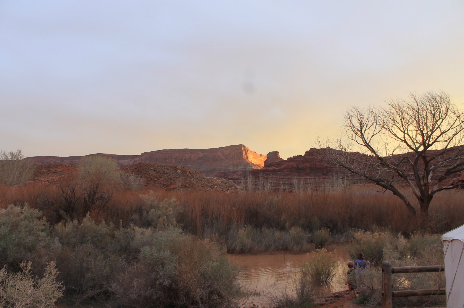Our friends were having a rough morning with their hound as well, so the boys swapped cars and the ladies had the pleasure of Ned and his seemingly endless bodily functions. Eventually after many disgusting emergency stops, we made it into the scenic canyon and finally into the town of Moab, UT breathing a sigh of relief. All the campsites along the river were full, being spring break time, so the backup plan was to drive further West and explore another canyon with several first come first serve campsites. We finally came to a good one with tons of open spots and vistas out of a John Wayne movie. Many good meals were prepared over the next couple days and cocktails by the campfire each night reinforced our family friendships.